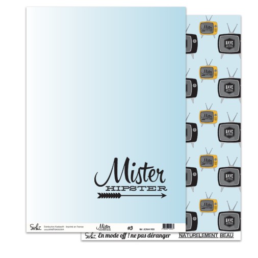 Collection Mister Hipster Pack de 6 papiers A4 imprimés recto-verso accompagnés d'une bande de 3 étiquettes (7x21cm) et d'une planche d'étiquettes (21x9cm). (seulement dans le kit collection) Dim 21x29,7cm. Grammage 250g 100% écoresponsable.